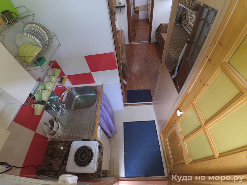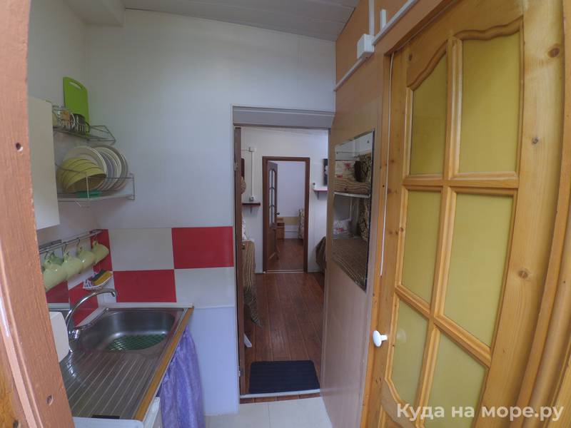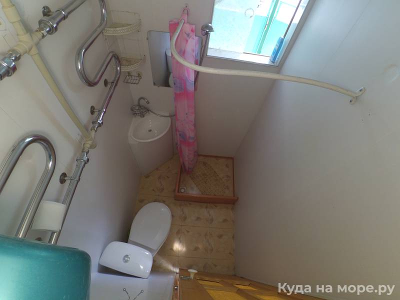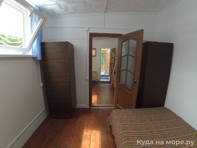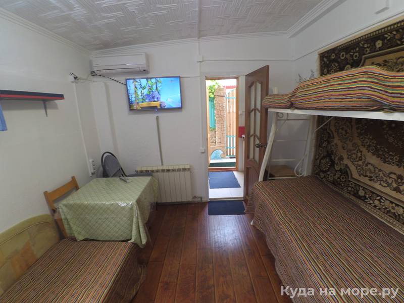 На первом этаже, уютный светлый двухкомнатный номер на 5 + человек, в номере кухонный уголок, плита, мойка, душевая комната и туалет, есть Wi-Fi, кондиционер, холодильник, телевизор. Первый этаж. В 2х минутах ходьбы от моря. Мангал по желанию.